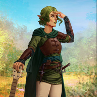 elf character with green hair. She is wearing a medieval-style outfit, including a cloak and boots, which suggests