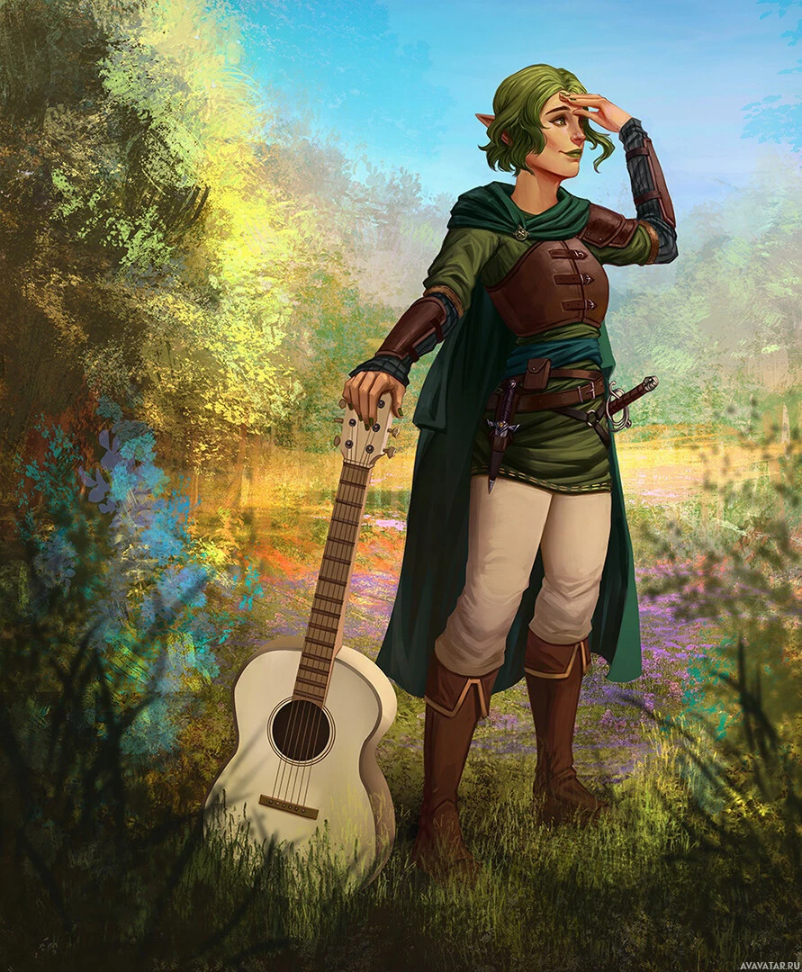 a fantasy setting. The elf is holding a guitar in her hand and appears to be looking at something off to the side, possibly indicating she is either performing or preparing to perform music. The background features natural scenery with trees and what seems to be