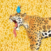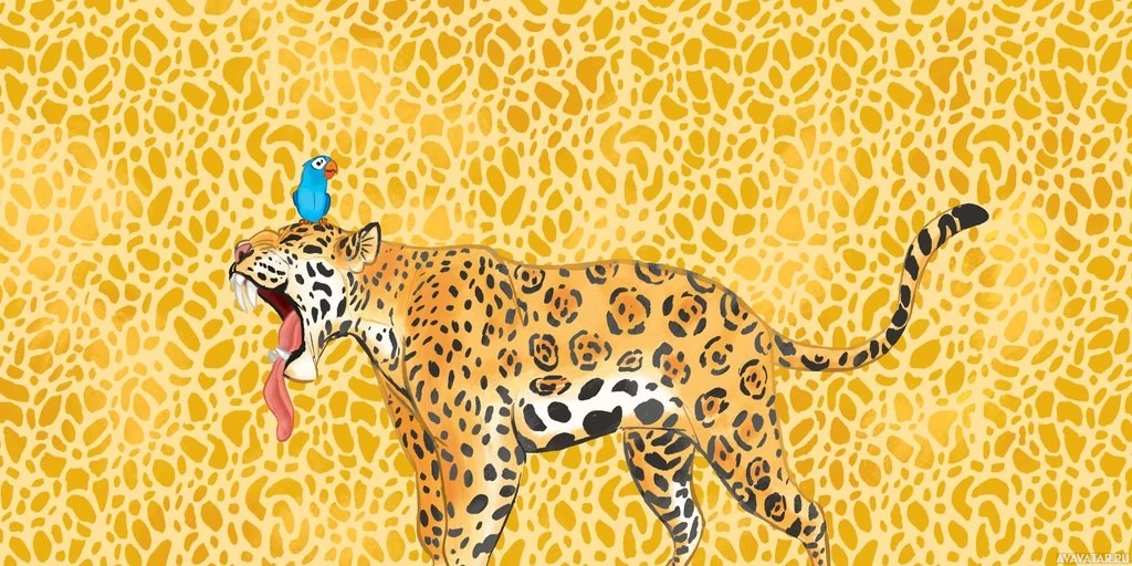 a natural setting with its mouth open as if it's panting or vocalizing. There is also a bird perched on the jaguar's head, adding a touch of interaction with another species. The background features a pattern that resembles