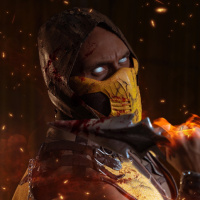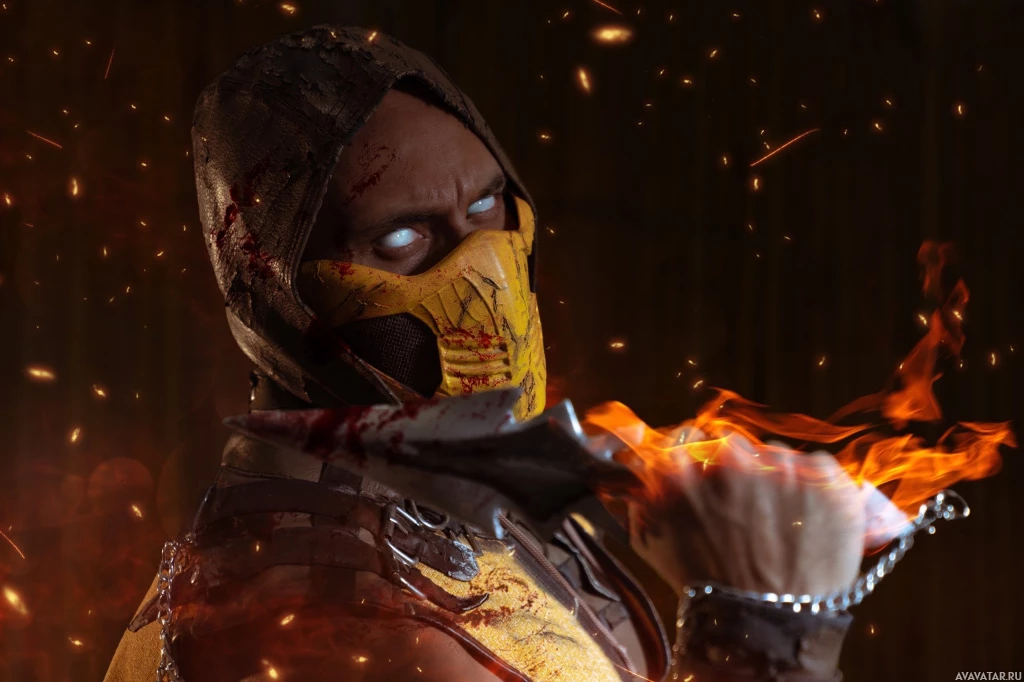 signature attire, which includes a yellow and black mask with an exposed skull, a sleeveless outfit, and a cape. His right hand appears to be on fire, and there are flames around him, suggesting that he has the power of pyrokinesis or the ability to control fire. The character is set against a backdrop that looks like it could be taken from a Mortal Kombat stage, with