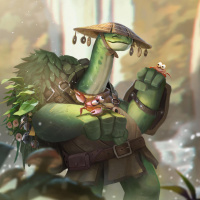 anthropomorphic turtle. This creature is wearing a hat and has an expression on its face that seems to convey