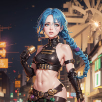blue hair, dressed in a futuristic outfit that includes armor and accessories. She has