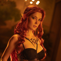 red hair. She is wearing what appears to be a fantasy-themed outfit, possibly representing the character of Little Red