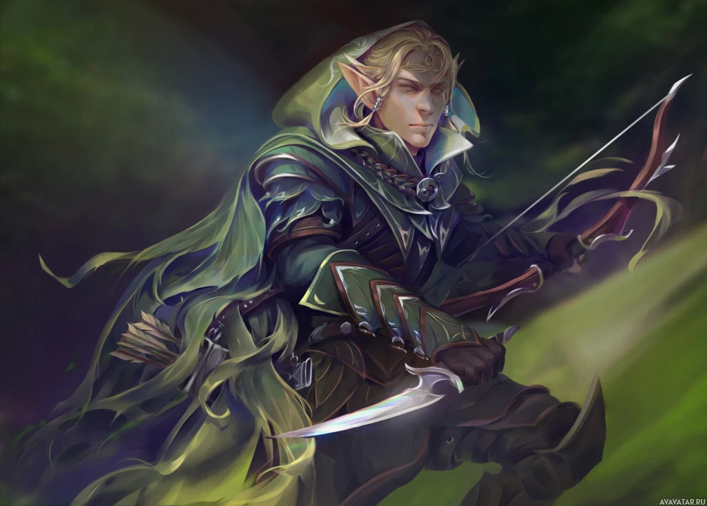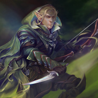 a fantasy genre, depicted as an elf wearing a hood. This character is holding a bow and arrows in one hand and what seems to be a staff or weapon in the other. They are dressed in armor that suggests a blend of fantasy and perhaps medieval or ranger-like design, which could imply they are from a game or a piece of literature set in