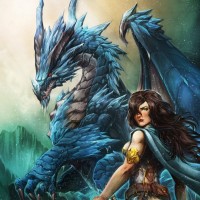 a blue dragon to her left. The dragon appears majestic and powerful with its wings spread out wide, showcasing