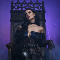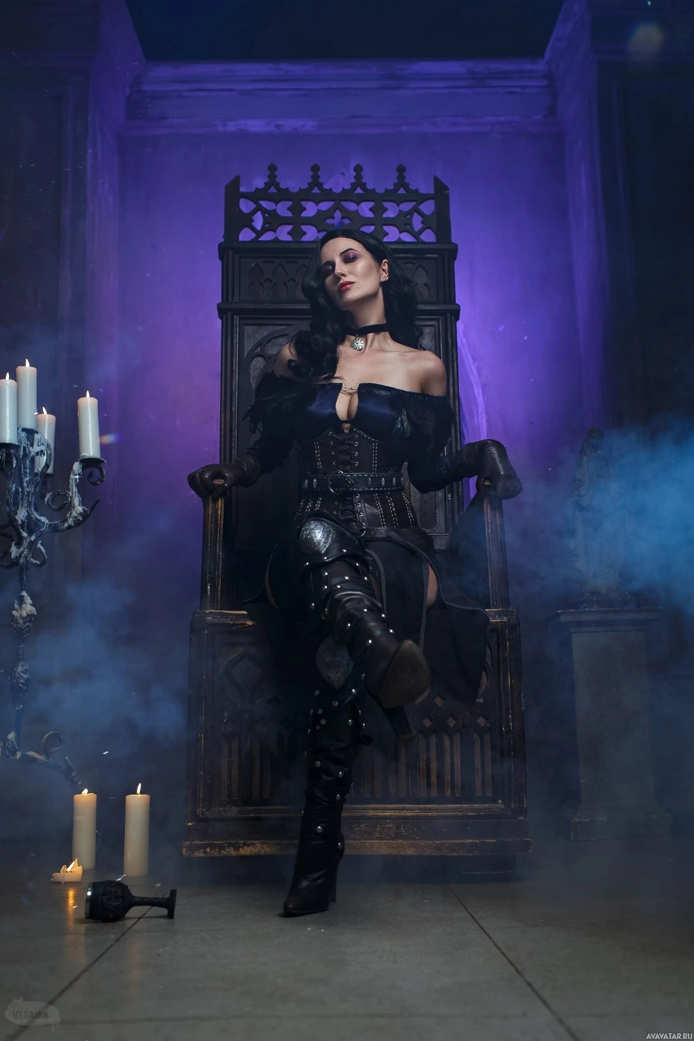 The image shows a person dressed in cosplay, portraying the character Yennefer from "The Witcher"