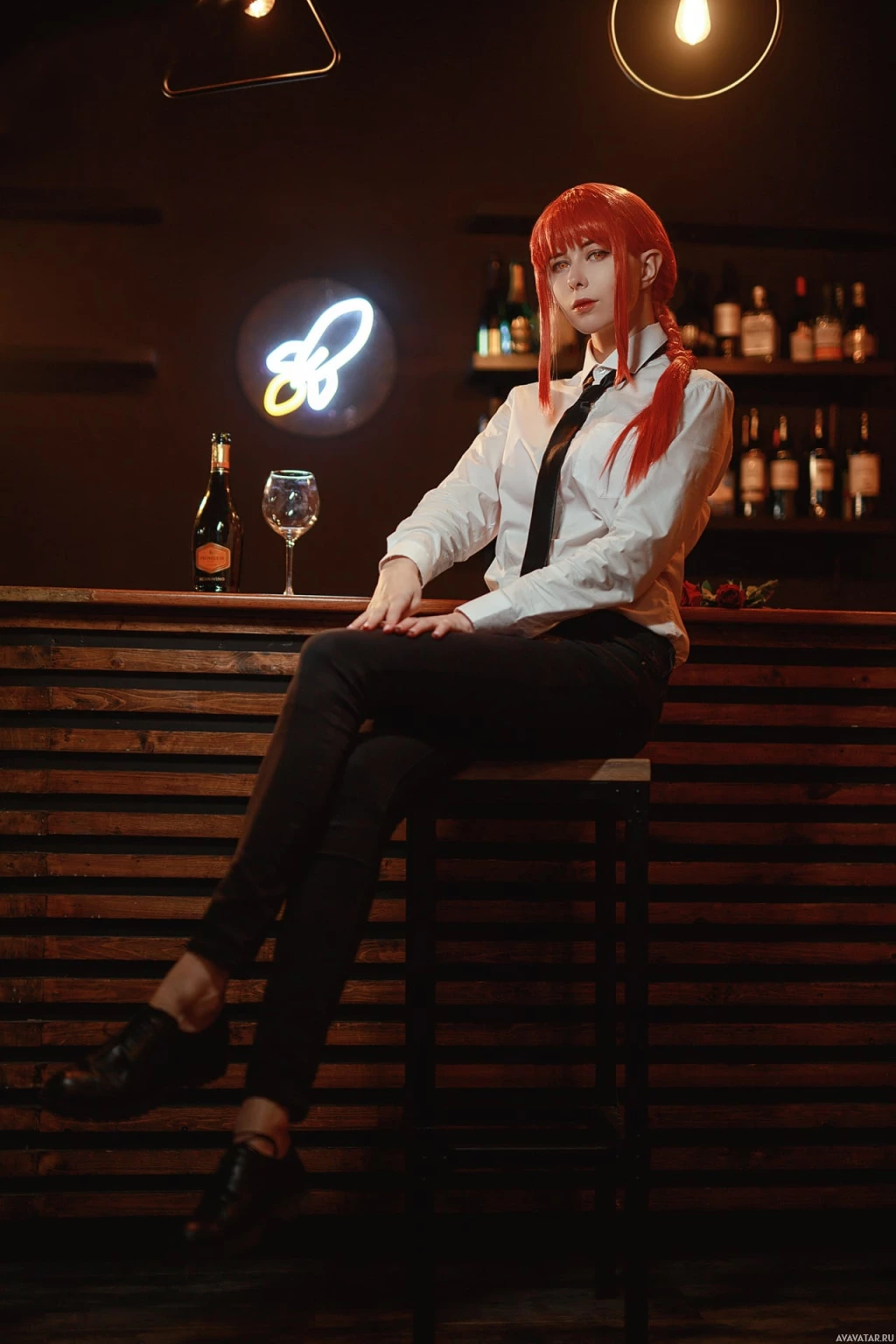 red hair styled in twin tails. She appears to be seated at a bar or similar establishment. She is wearing