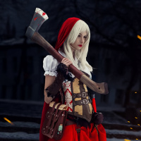 white hair, which is styled back, and she's holding an axe in her right hand. Her clothing features what appears to be