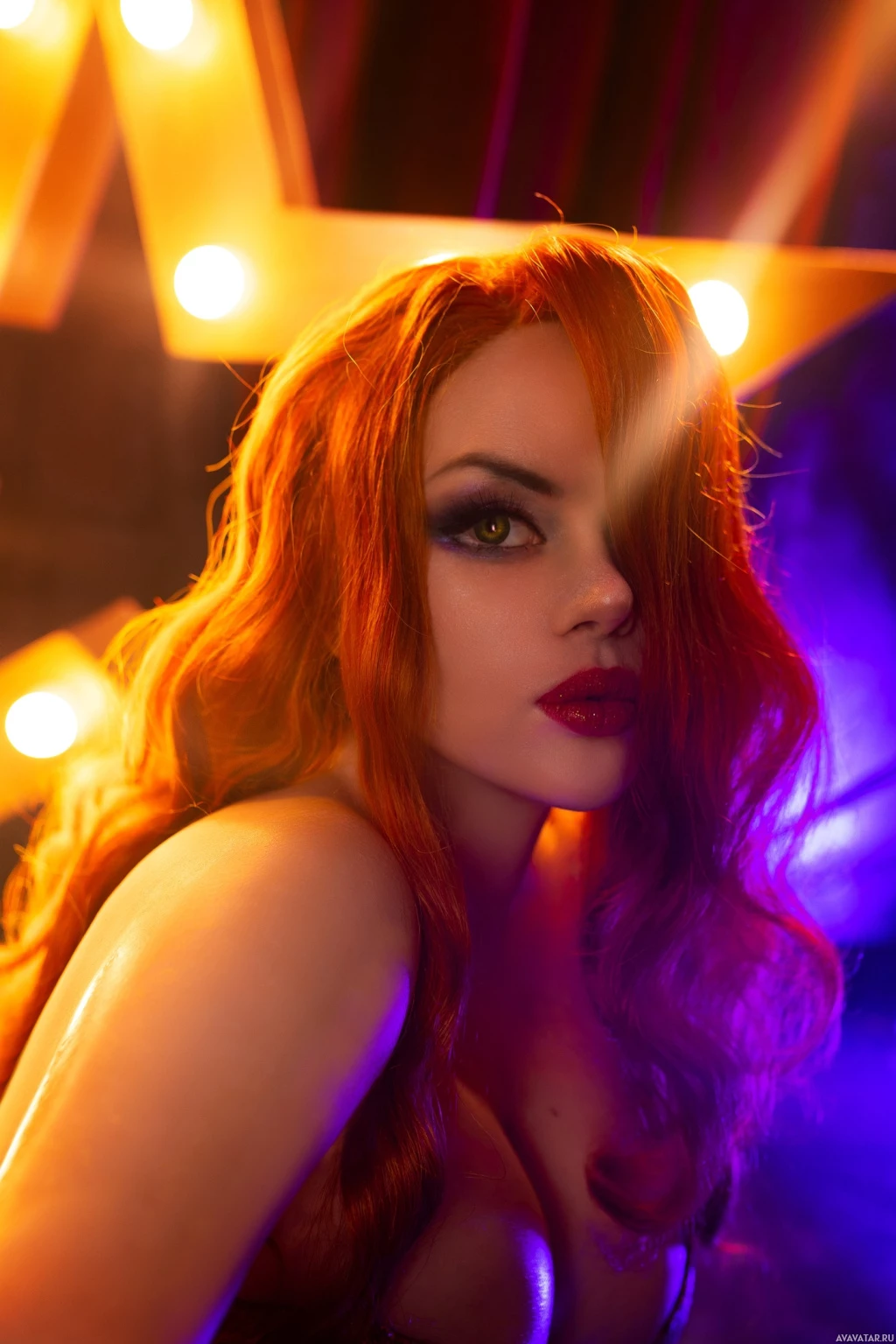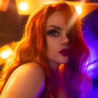 The image depicts a woman with red hair, wearing makeup and striking a pose. She appears to be in an illuminated environment with stage lighting, giving her an edgy or dramatic look.