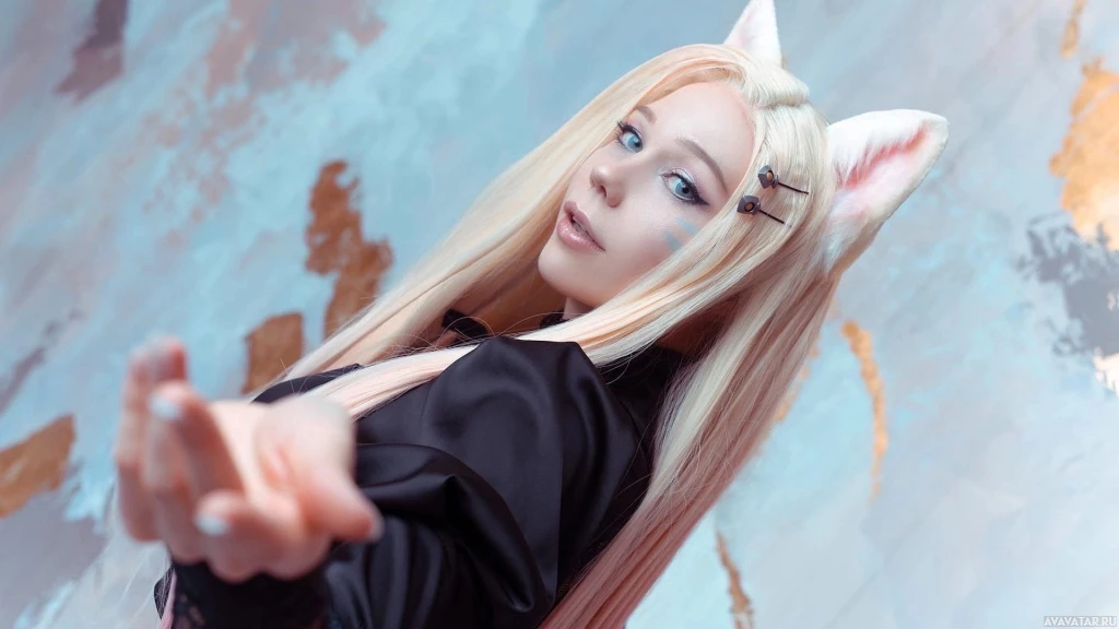 League of Legends. The character being portrayed has cat-like features such as ears and possibly other elements inspired by the game's design for Ahri. The person is posing with their hand outstretched, giving off an expression that could be interpreted in various ways depending on context, but it might suggest