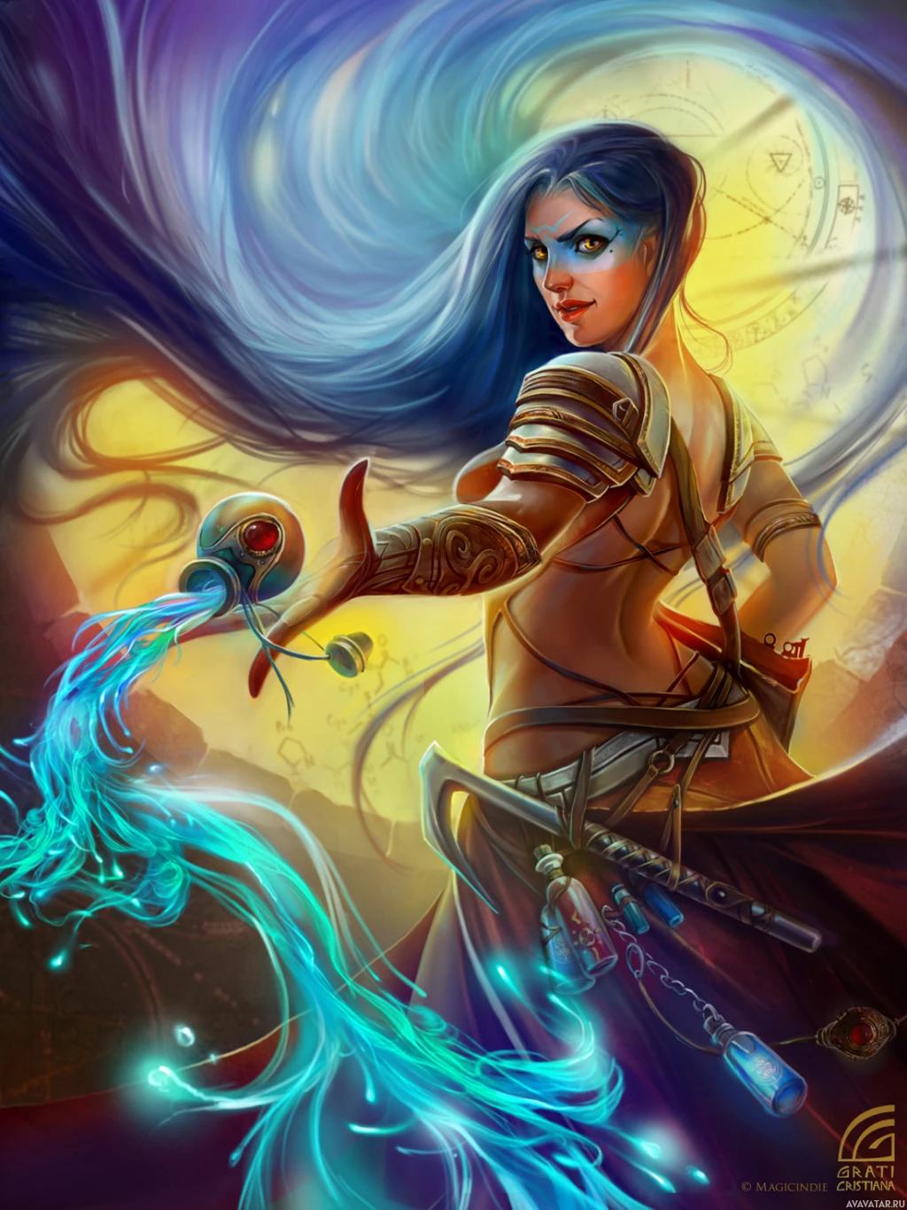 a fantasy character with blue hair, depicted in profile view from behind. The character is wearing what appears to be armor and holding a magical wand or staff that is releasing a stream of water or some kind of