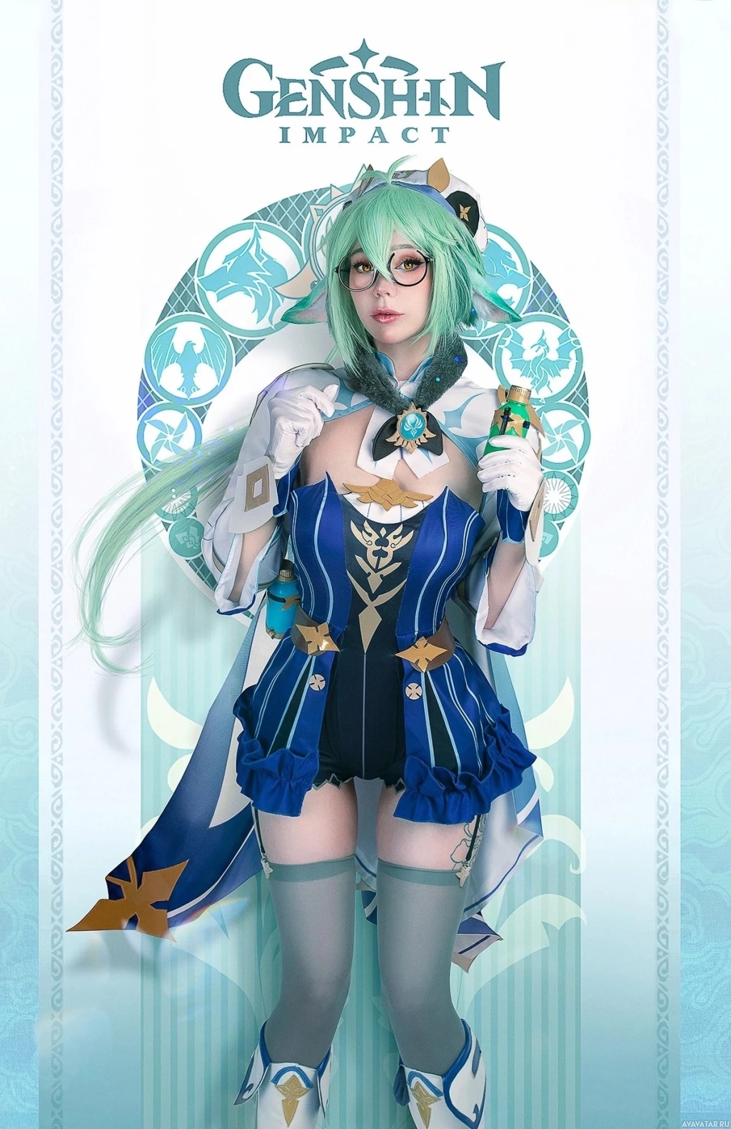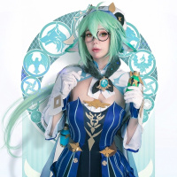 a cosplay outfit and is standing against a backdrop that includes elements such as swords, suggesting an adventurous or combat-related theme within the game. The character's attire and accessories are detailed, indicating she might be from one of the more fantasy-oriented regions of the game's world.
