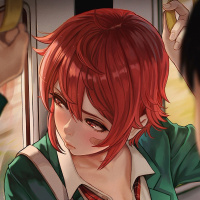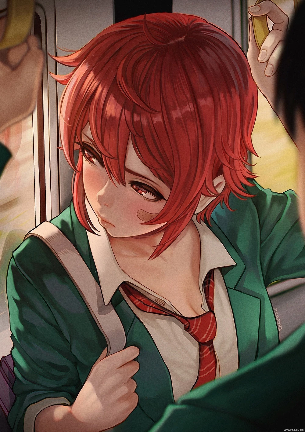 red hair, wearing a school uniform that includes a blazer, a white shirt, and a tie. She appears to be looking out of