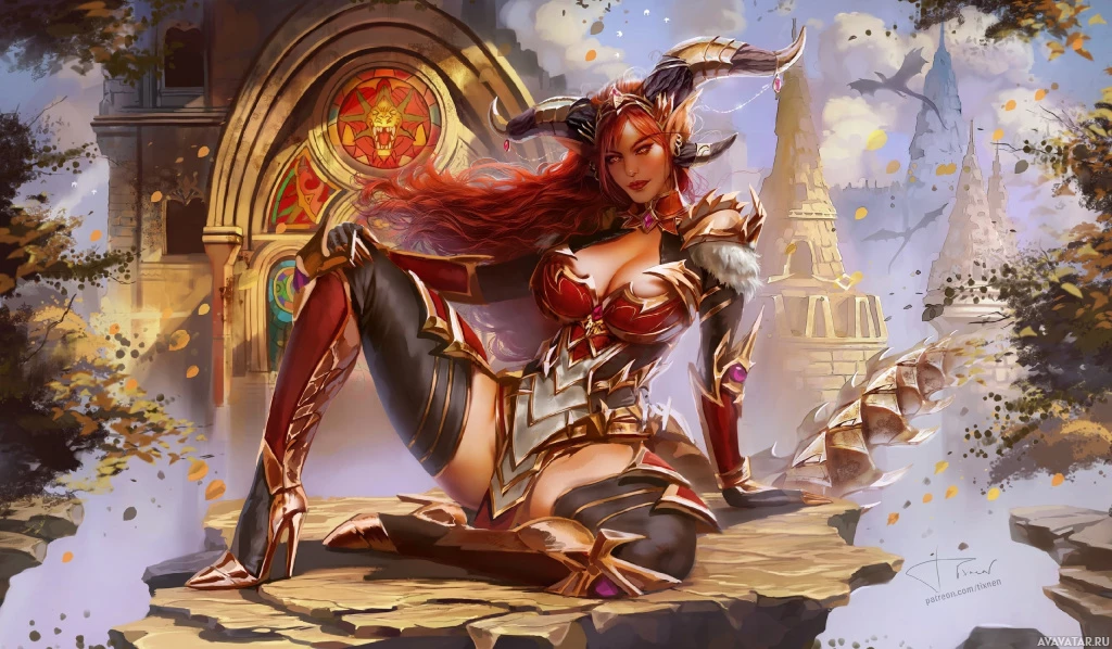 a fantasy character with red hair, depicted as a demon. This figure is prominently displayed against