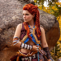 На картинке изображен персонаж женского пола в доспехах и с луком в руках, стоящий на открытом воздухе на фоне скал и деревьев. У нее рыжие волосы, заплетенные в косу, и, похоже, она из фантастического мира, возможно, вдохновленного такими играми, как "Horizon Zero Dawn". Костюм наводит на мысль, что в контексте ее повествования у нее может быть роль, связанная со стрельбой из лука или боем.