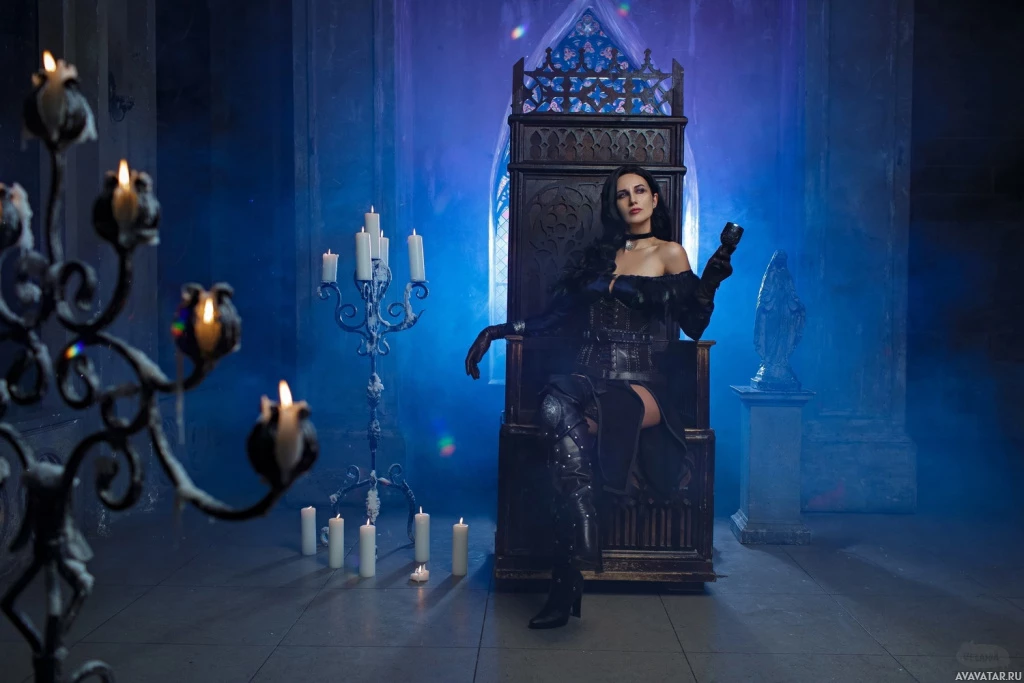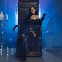 an old castle or cathedral. The individual is seated on what appears to be a throne, wearing costume elements that include a corset, skirt, and boots consistent with the character's appearance in the game. The overall atmosphere of the image suggests