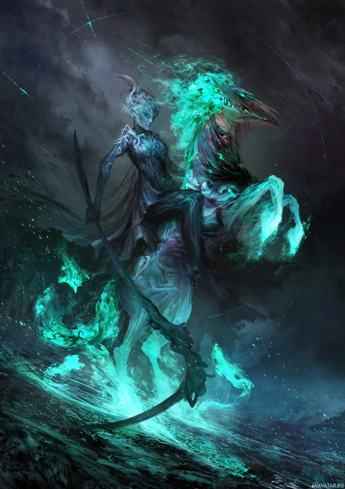 a fantasy scene featuring a character riding a mythical creature, possibly a griffin or a similar hybrid beast, with a fantastical and ominous atmosphere. The character appears to be dressed in armor or