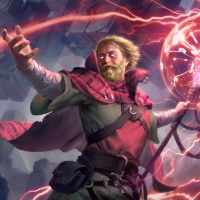 the glowing energy emanating from his hand and the swirling patterns in the air around him. The setting suggests a dramatic, possibly