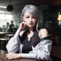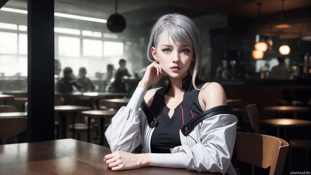 The image features a person sitting at what appears to be a table in a cafe or similar establishment. This individual has short,