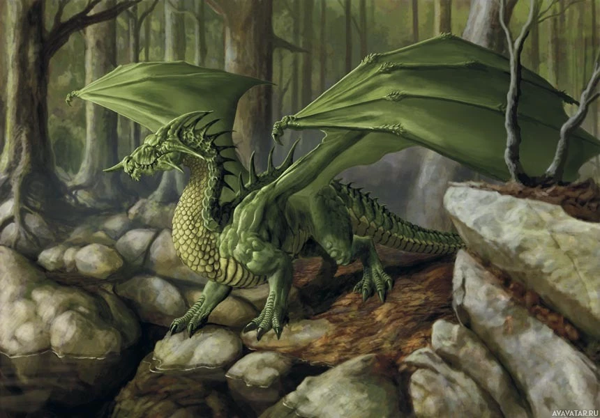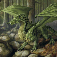 The image shows a fantasy-style depiction of a dragon. It features a creature with large green wings and scales, standing on