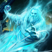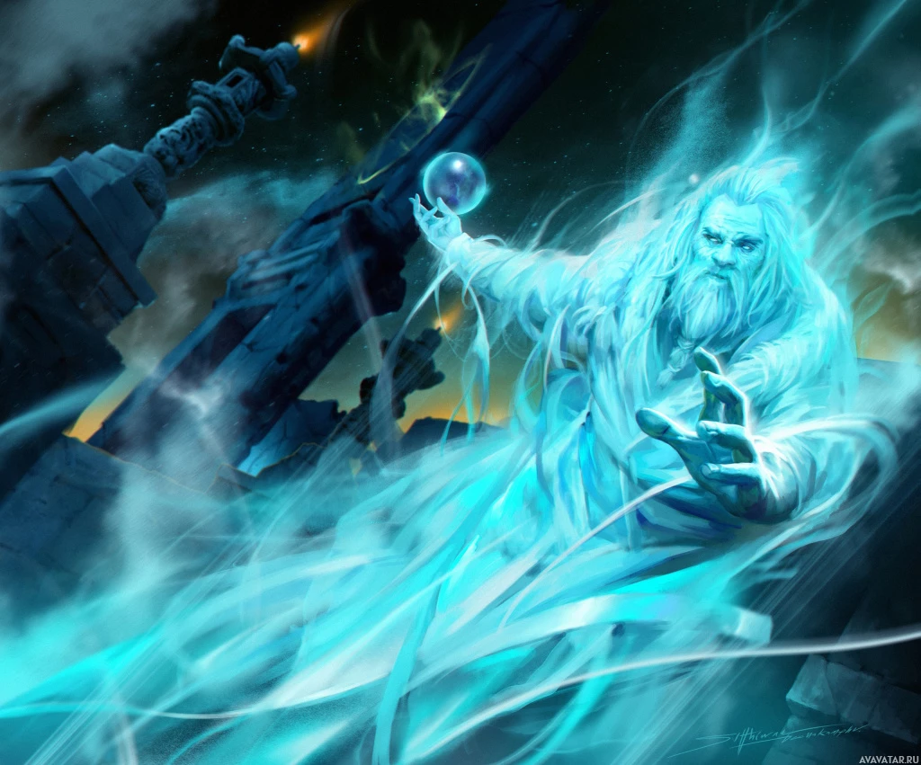 a fantasy scene with a character that appears to be a wizard or magical figure. The figure has a long white beard and is casting a blue