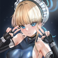 blonde hair styled in twin tails. She is wearing a black and blue bodysuit with a zippered front and thigh-