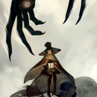 a young woman, possibly an adventurer or explorer, seated on the ground. She has a lantern in her hand and is facing away from us, looking towards a menacing creature that resembles a giant spider or monster with