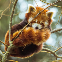 red panda, a type of arboreal mammal, clinging to the branches of a tree. Red pandas are known for their striking reddish-