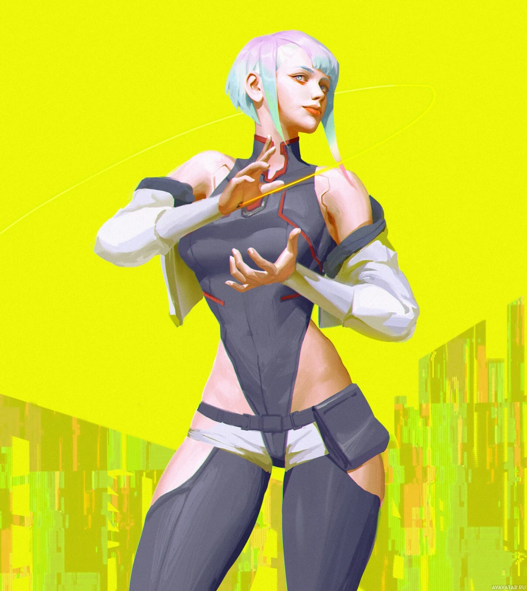 the video game "Cyberpunk 2077." This character is named Lucy, and she is depicted as a futuristic, tech-