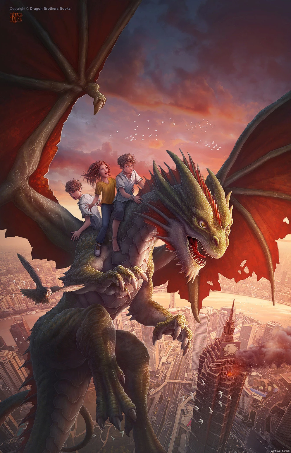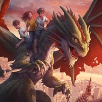 a fantastical scene with three children sitting on the back of a large, menacing-looking dragon that dominates the skyline. The dragon has wings and