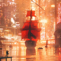 На картинке изображен городской пейзаж на закате. Вдали виден водный массив, ведущий к пришвартованному кораблю, а заходящее солнце создает теплый отблеск на горизонте и зданиях. В этой сцене есть что-то художественное или фантастическое, возможно, вдохновленное фильмами или играми, действие которых разворачивается в альтернативных вариантах будущего или мифических мирах.