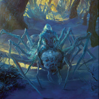 a fantastical scene with a spider-like creature in the foreground, appearing to be walking across a snowy path. There is