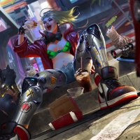 futuristic scene. In the foreground, there is a woman with a cyberpunk-inspired appearance. She has various mechanical parts, such as robotic arms and legs, suggesting she might be part of a future society that integrates technology with