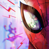 supporting cast, possibly indicating a team dynamic associated with the character. The overall composition is energetic and colorful, capturing the essence of the Spider-