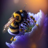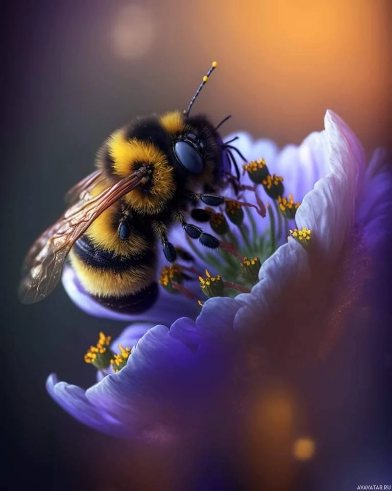 purple petals. The bee's wings are spread out slightly, showing its pattern typical for this species, which consists of alternating dark and light stripes that are characteristic of yellowjackets.