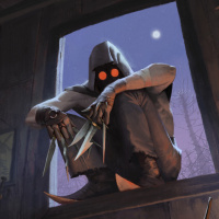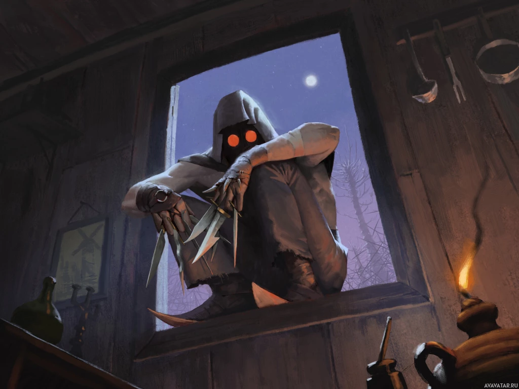 fashioned room. The individual is wearing a hood and has a knife in their hand, suggesting they might be engaged in some
