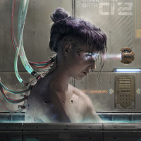 The image depicts a character with a combination of human and machine-like features, suggesting