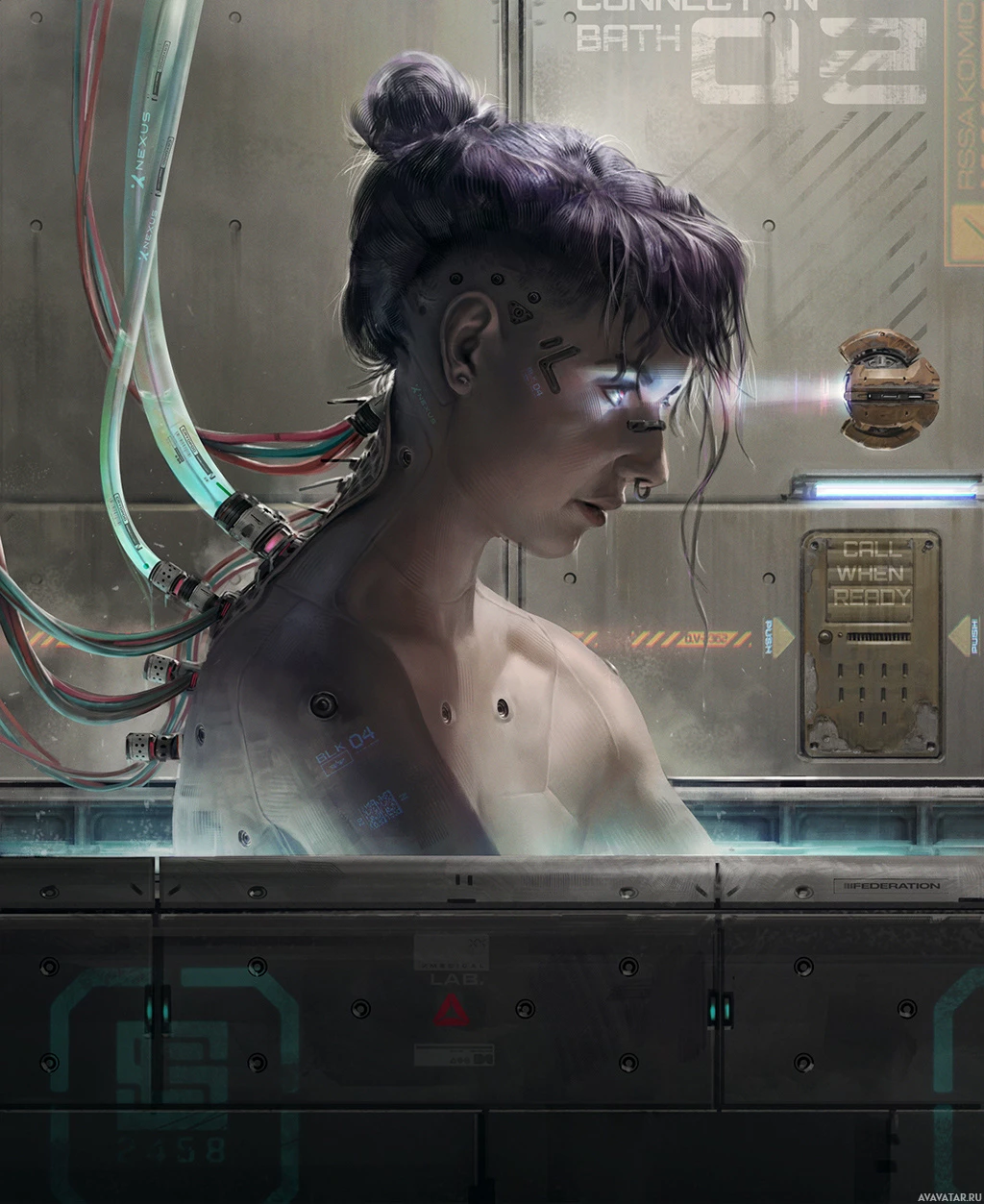 a science fiction setting. The person has visible wires or tubes attached to their head and chest, implying