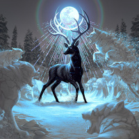 a fantasy scene featuring an animal, specifically a deer. It is set in what appears to be