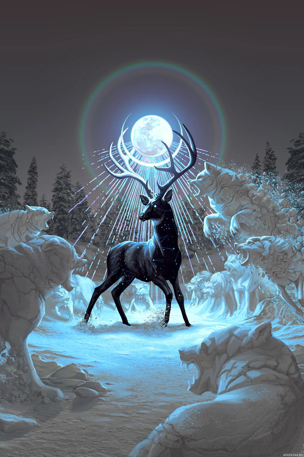 a winter landscape with snow on the ground and trees surrounding the central figure. The deer has large antlers and stands majestically under