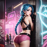 an urban environment, possibly an alley or street in a nighttime cityscape with neon signs and graffiti visible in the background. She is posed with one hand resting on a wall and her other hand on her hip, leaning slightly forward as if she is walking toward the viewer.