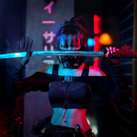 a female character who appears to be from an anime or manga series. She is holding a sword and has a futuristic, cyber-punk style appearance with elements such as
