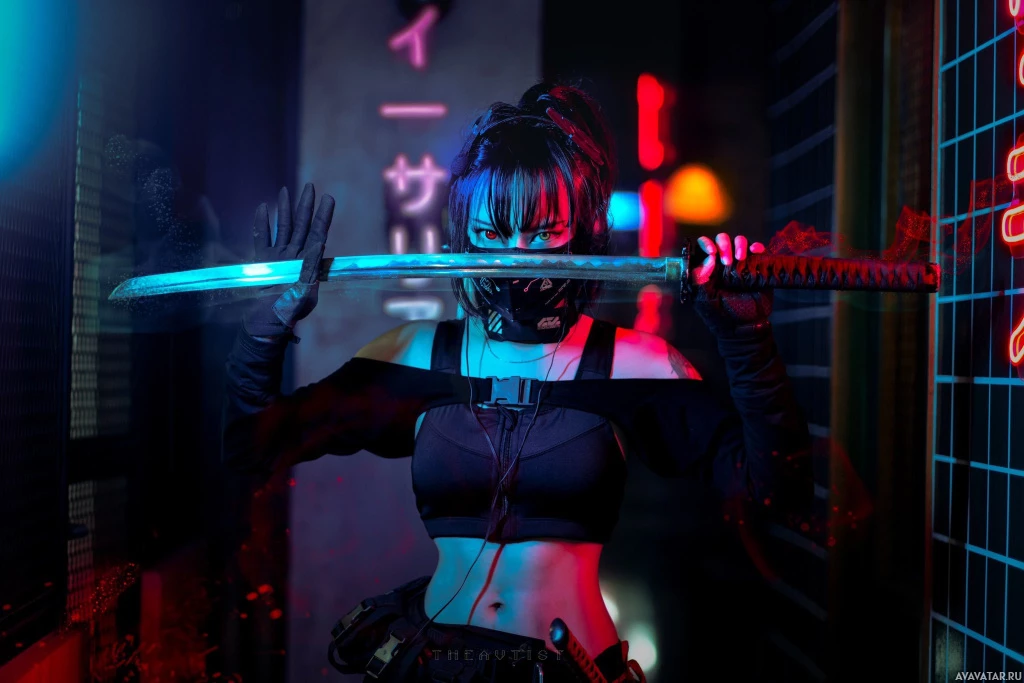glowing eyes, neon lights in the background, and a highly detailed costume. The artwork is vibrant with