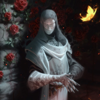 ominous tones that suggest a nighttime or underworld setting. There are roses with thorns scattered around, possibly symbolizing danger or passion. Additionally, there are butterflies floating nearby, which might be indicative of transformation or