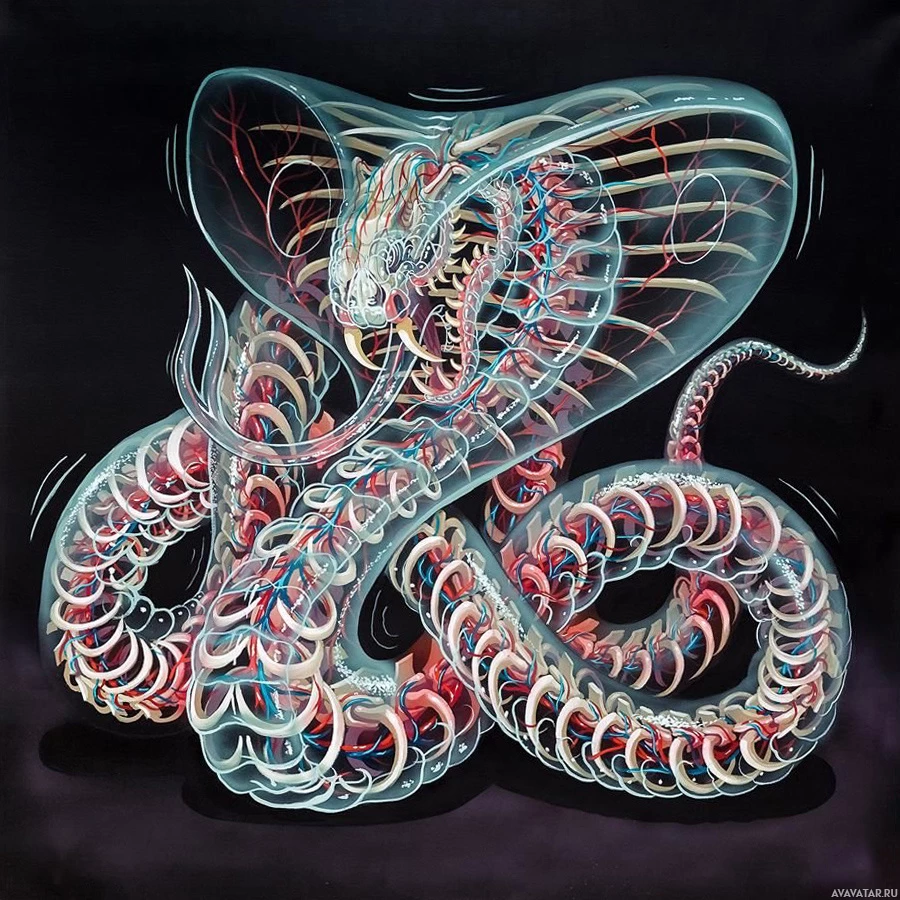 a human skeleton. The body of the creature resembles a snake, with its scales visible in