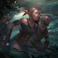 fantasy setting. They appear to be in a forest or
