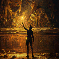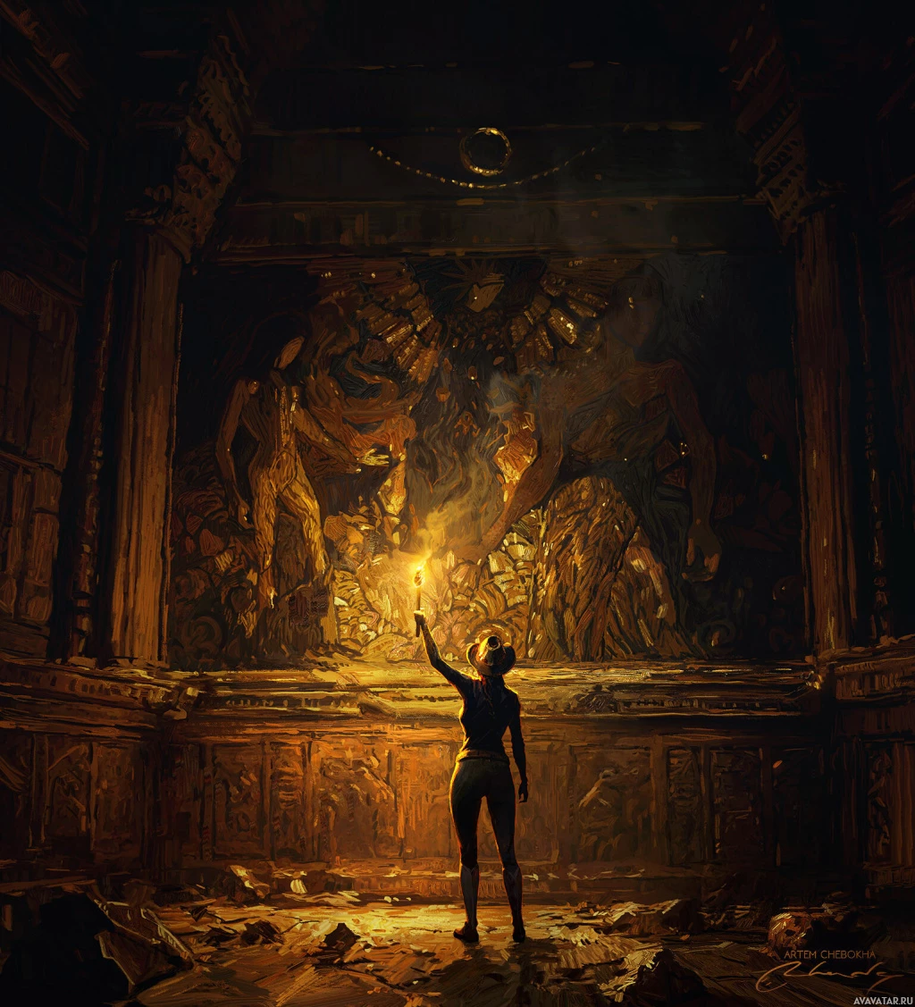 ancient hallway. The individual is holding up a torch high above their head, illuminating