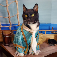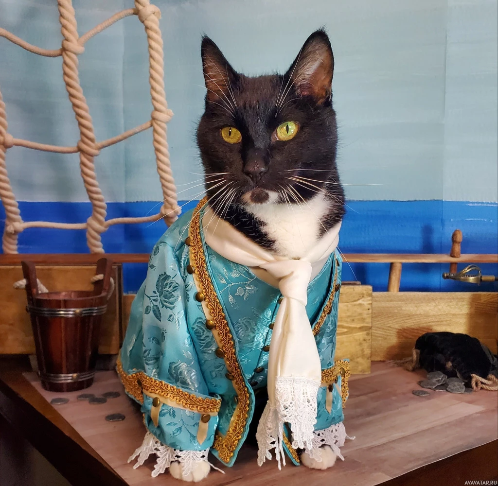The image shows a black and white cat dressed in pirate-themed clothing. The outfit includes