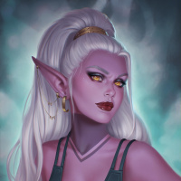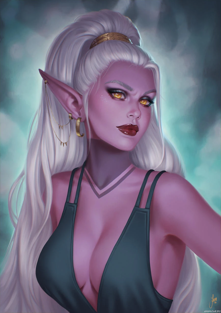 white hair styled in elegant waves, pointed ears typical of an elf, and striking purple skin with yellow eyes that give her a glowing appearance. Her makeup is dramatic, featuring dark lipstick and