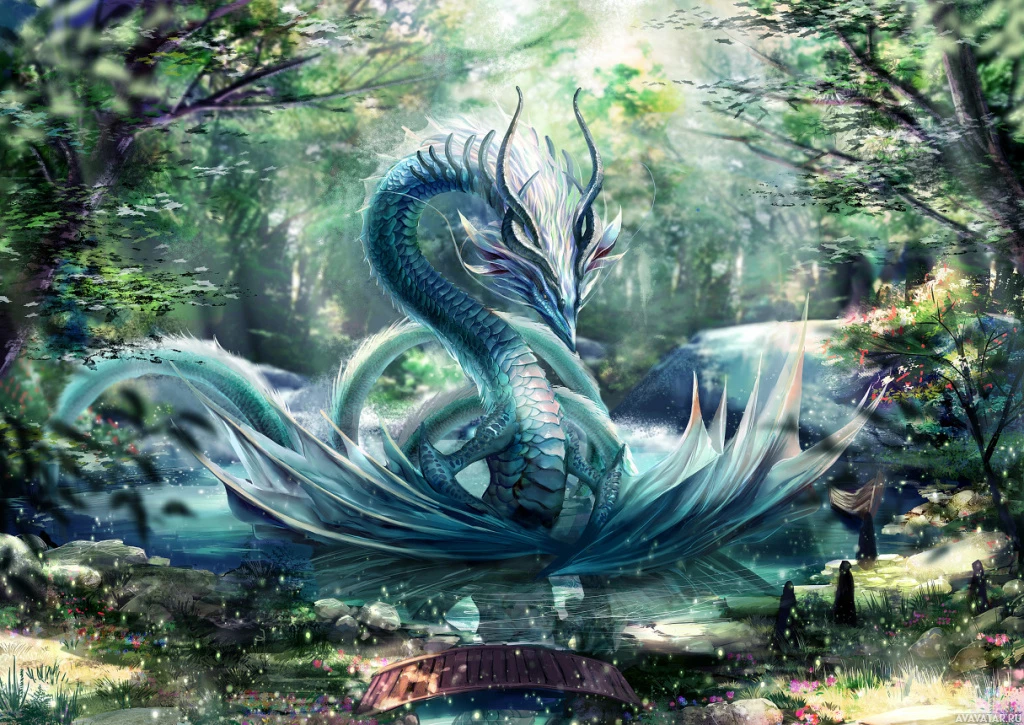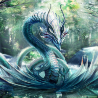 a body of water, possibly a lake or river, with its wings spread out and tail curled around its body. It has a serpentine form with scales that are shimmering in various colors, suggesting it might be made of crystals or possess